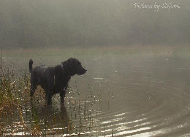 Then our buddy wanted to 'swim'... mist drifted over the surface of the tiny basin in the woods, but we couldn't stay too long because the little one was eager to go in too...